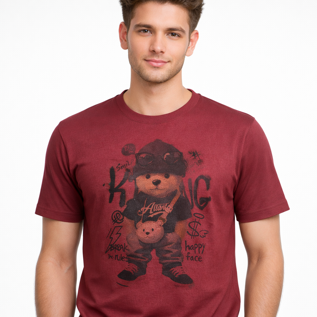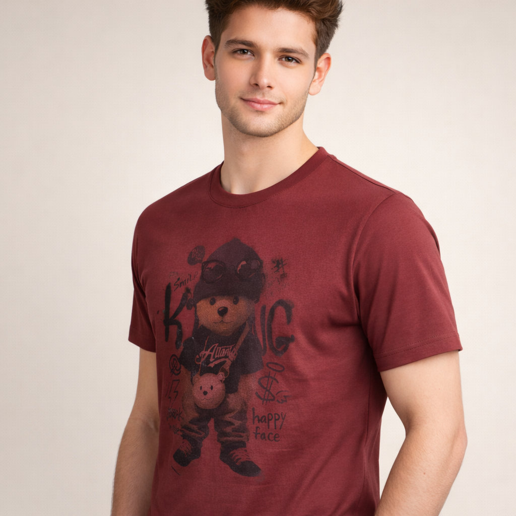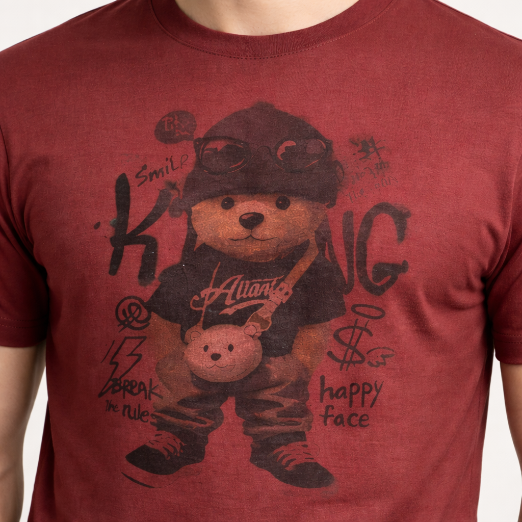 Upgrade your everyday style with this premium maroon round-neck graphic t-shirt featuring a trendy teddy bear streetwear print. Designed for modern youth fashion, this t-shirt gives a cool and confident vibe with its vintage faded artwork.
