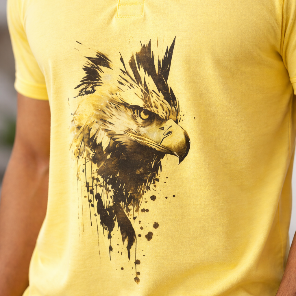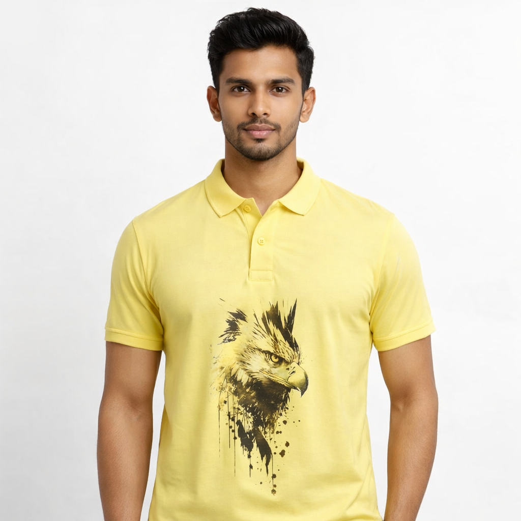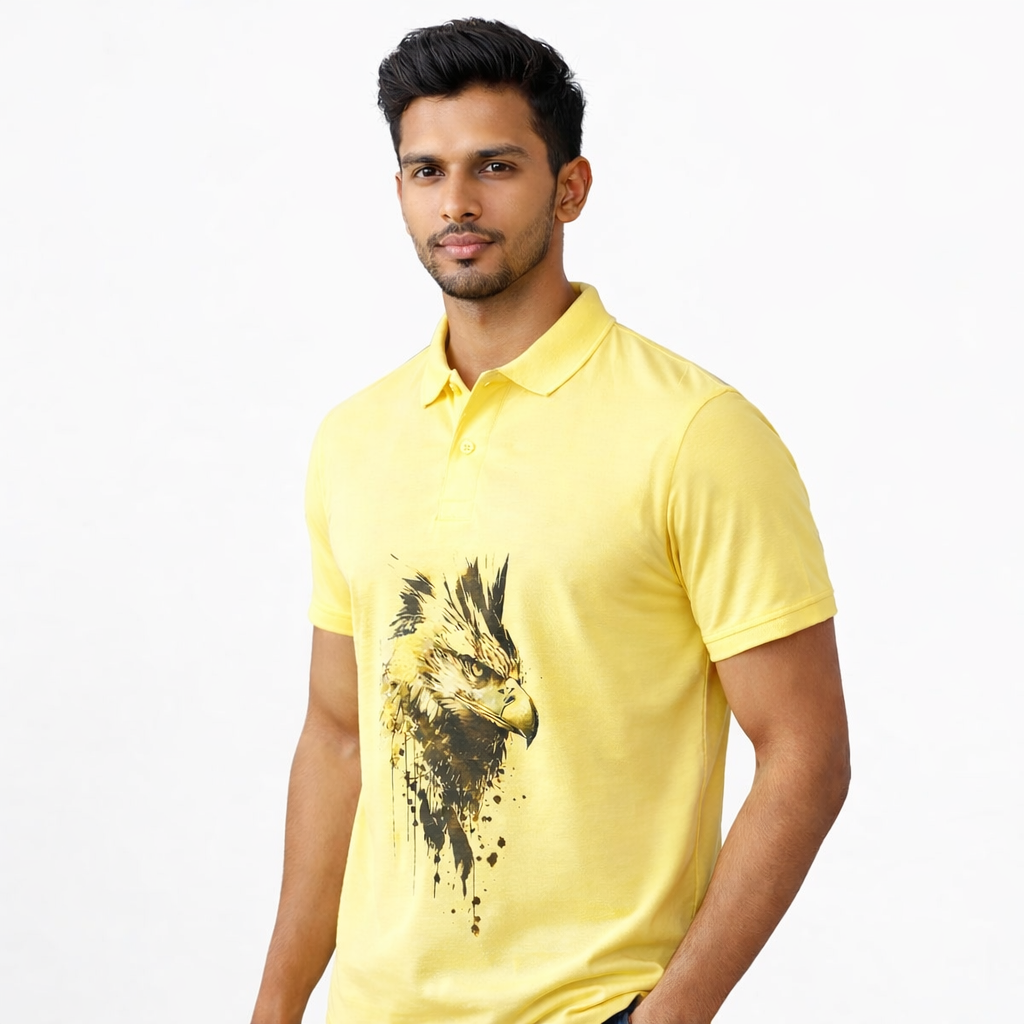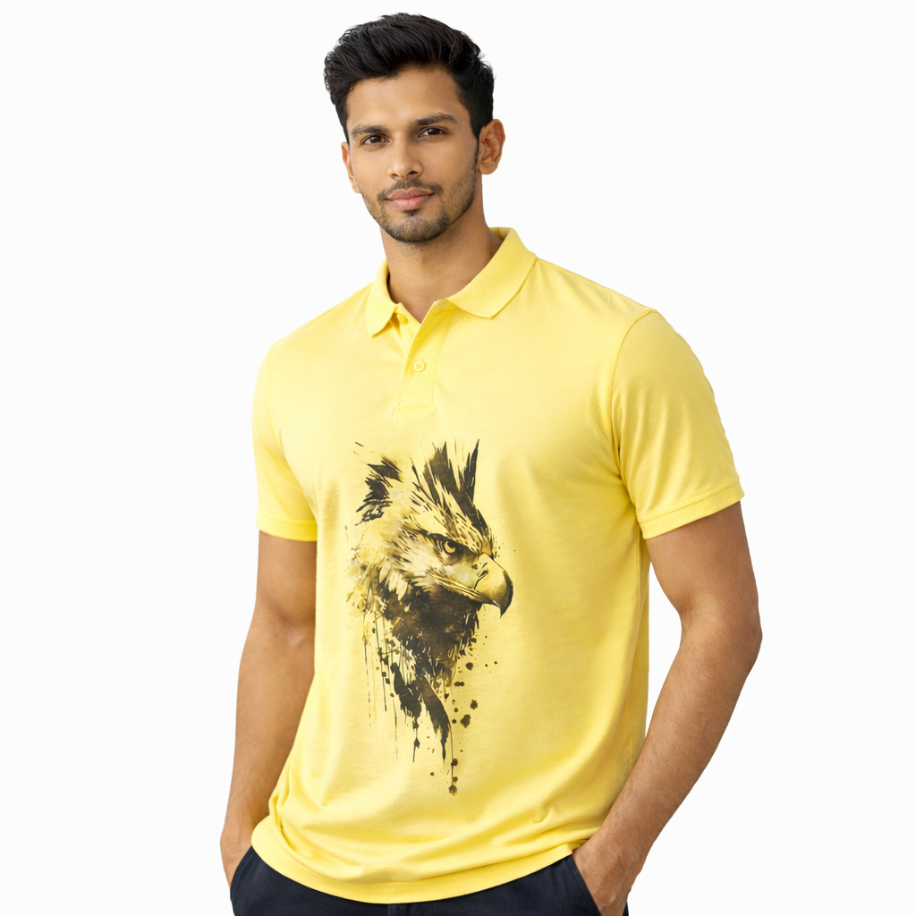 Men’s Yellow Polo T-Shirt with Artistic Eagle Print – Premium Street Style