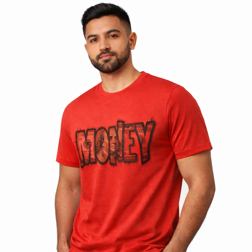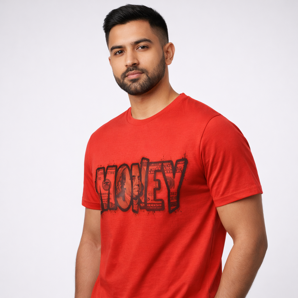 Upgrade your style with this trendy red MONEY printed T-shirt, designed for men who love bold fashion and streetwear vibes. Premium cotton fabric ke saath yeh T-shirt comfortable, breathable aur long-lasting hai — daily wear se lekar party look tak perfect choice.